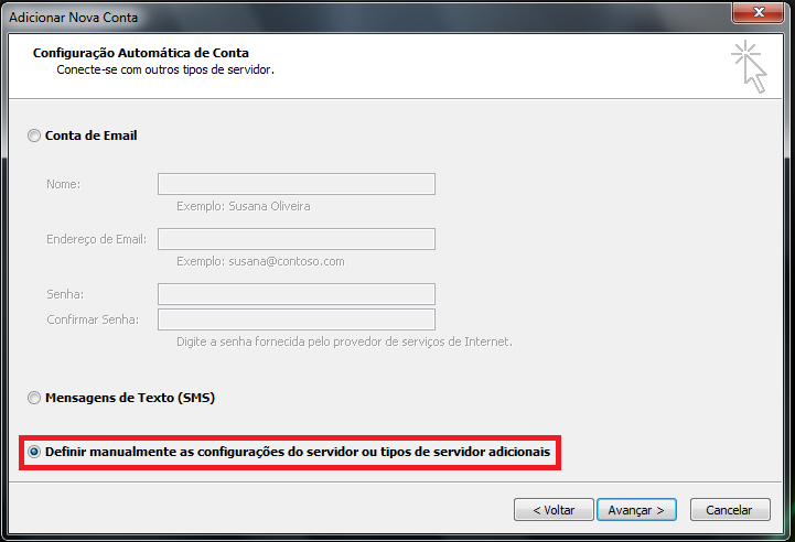 Logo após, por padrão, o Outlook, vai deixar selecionado o Item "Conta de E-mail", Altere para "Definir manualmente as configurações do servidor ou tipos de servidor adicional" e clique em avançar