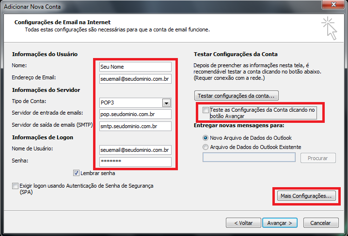Você ja pode começar a usar seu Microsoft Outlook com seu endereço de e-mail. Se acontecerem erros, revise os passos anteriores. Se tudo estiver certo, e mesmo assim não estiver funcionando, acione o suporte por Team Viewer ou pelo Whatsapp.