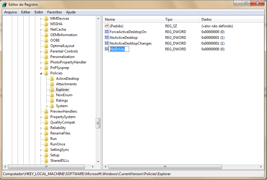 Se pretender ocultar todas as drives visíveis defina o dado do valor para 67108863.