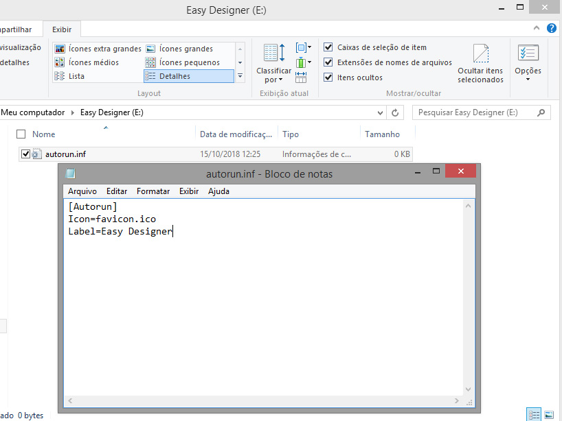 Observação. Em "Icon", digite o nome do arquivo do ícone do pendrive. No nosso caso sera "favicon.ico". Já em "Label", digite o nome que você quer que o dispositivo tenha;