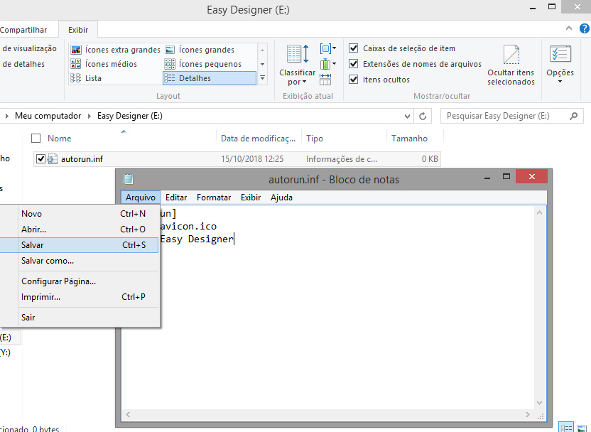 Digite o nome do arquivo do ícone e do pendrive no bloco de notas