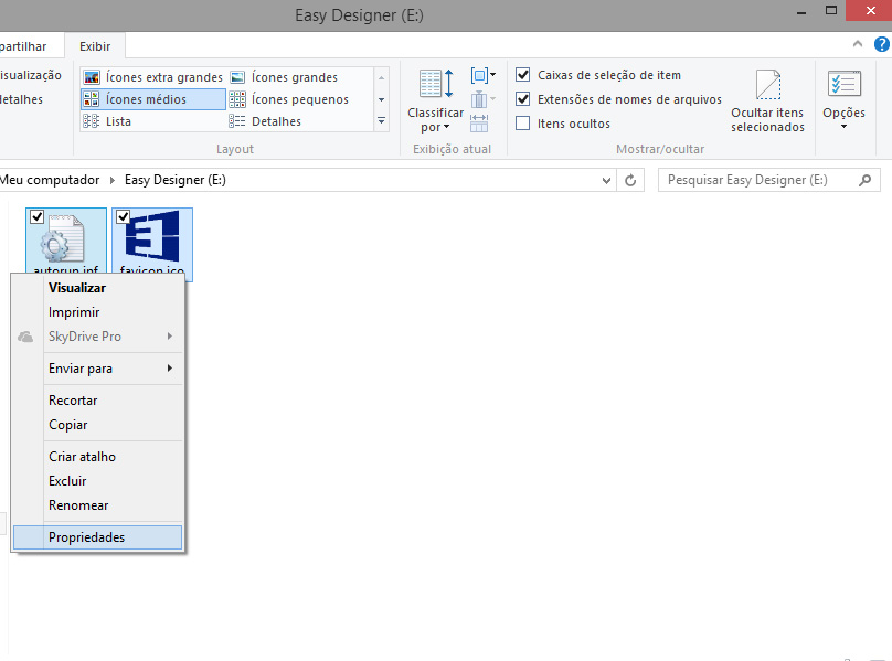 Passo 8. Selecione os dois arquivos do pendrive no Windows Explorer, clique com o botão direito e escolha a opção “Propriedades”;