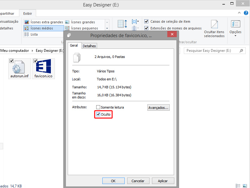 Passo 9. Na guia "Geral", selecione “Oculto” e depois clique em "Aplicar", seguido de "OK". Isso evitará que os arquivos sejam apagados por acidente;