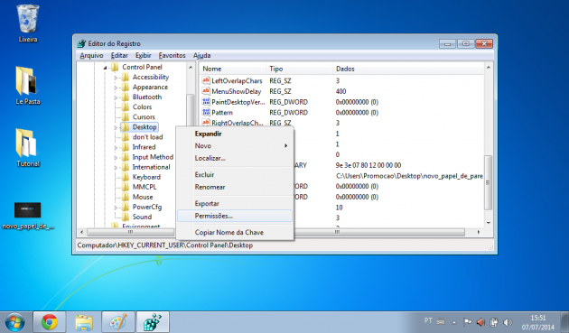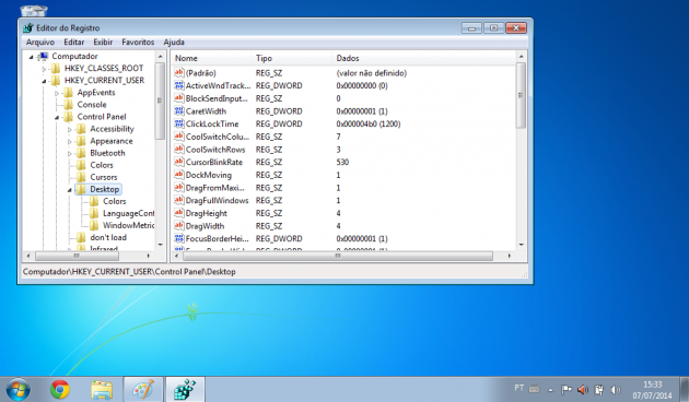 Na janela que aparecer, procure e abra a pasta "HKEY_CURRENT_USER", no menu à esquerda. Em seguida, selecione o diretório "Control Panel" e, lá dentro, "Desktop".