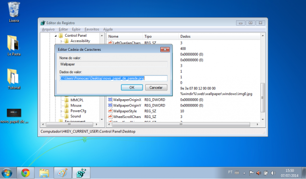 Dentro da pasta "Desktop", procure pelo valor "Wallpaper" e dê um duplo clique para editar o caminho padrão para aquele do arquivo que será o seu novo papel de parede. Aqui no nosso exemplo, usamos um arquivo .jpg chamado "novo_papel_de_parede", que está localizado na própria área de trabalho.