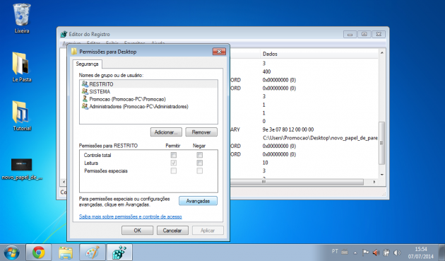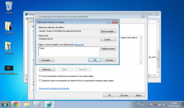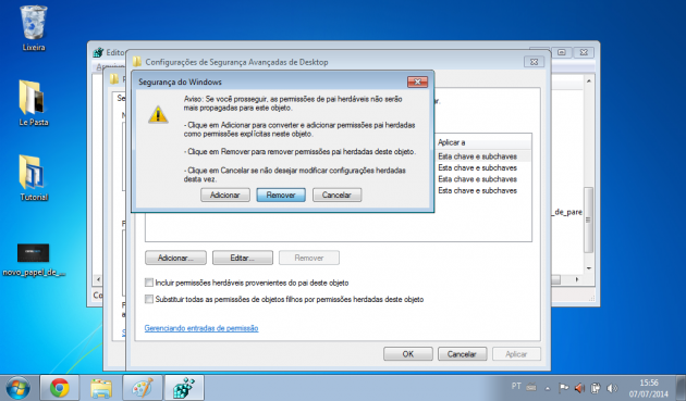 Clique mais uma vez em "Avançadas" e desmarque a opção "Incluir permissões herdáveis provenientes do pai deste objeto". O Windows abrirá uma janela para confirmar a operação, clique em "Remover". O sistema vai apagar todos os nomes que estavam dentro do menu "Entradas de permissão".