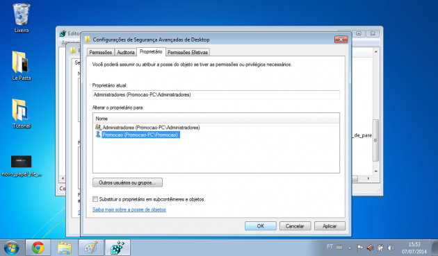 Em seguida, clique com o botão direito na pasta "Desktop" e clique em "Permissões". Clique em "Avançadas", depois entre na aba "Proprietário". Selecione o seu nome de usuário e clique em OK.