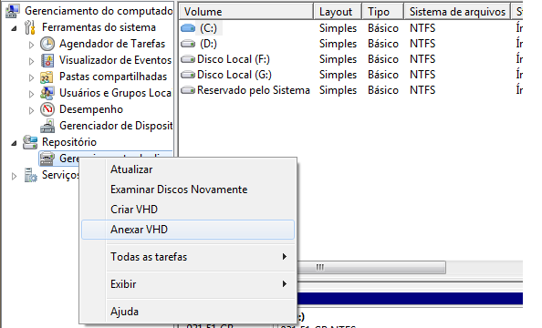 Esses arquivos podem ser montados no Windows. Para montar imagens VHD, vá ao gerenciador de disco (botão direito no item Computador do menu Iniciar > Gerenciar). Clique no item Gerenciamento de disco com o botão direito e escolha Anexar VHD (é possível também criar um VHD vazio). Localize o arquivo: