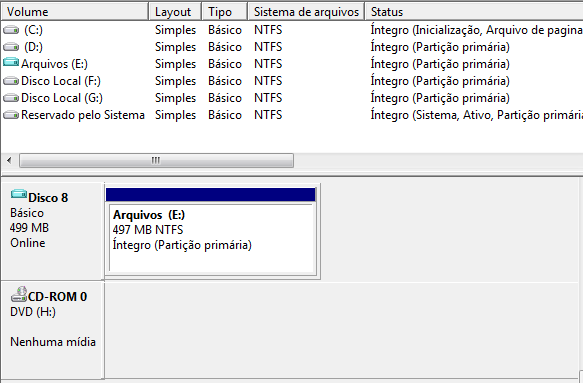 Ele ficará disponível no gerenciador. Se quiser, marque “Somente leitura” para não permitir alterações. Para usar a imagem será necessário clicar na área referente a ela com o botão direito e ir em Inicializar disco. Você pode particionar o VHD assim como faria com um HD real. Na imagem abaixo o Disco 8 é um VHD: