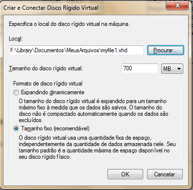 Para um melhor desempenho “anti-fragmentação” é bom escolher tamanho fixo, mas como você deve saber (caso já trabalhe com máquinas virtuais) o arquivo que vai crescendo conforme os dados forem sendo adicionados pode ser melhor – melhor para fazer backup, mais rápido para copiar, etc, além de não usar muito espaço no seu HD real enquanto realmente não estiver com toda a capacidade em uso.