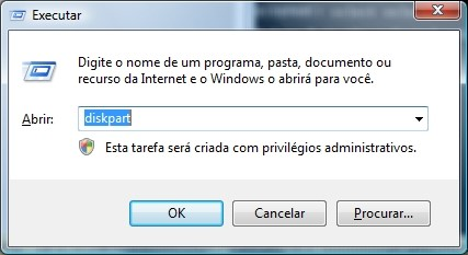 1 - Abra a janela Executar do Windows utilizando o atalho Windows+R e digite “diskpart”. Com isso, abrirá uma janela com o Prompt de Comando;