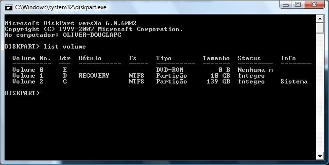 2 - Digite “list volume” e aperte a tecla Enter. Assim, surgirá uma lista com todas as partições do disco rígido;