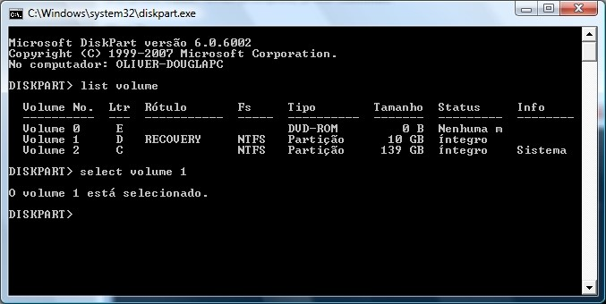 4 - Utilizando o nosso exemplo, digite “select volume 1”. Mude o número do volume de acordo com sua necessidade;