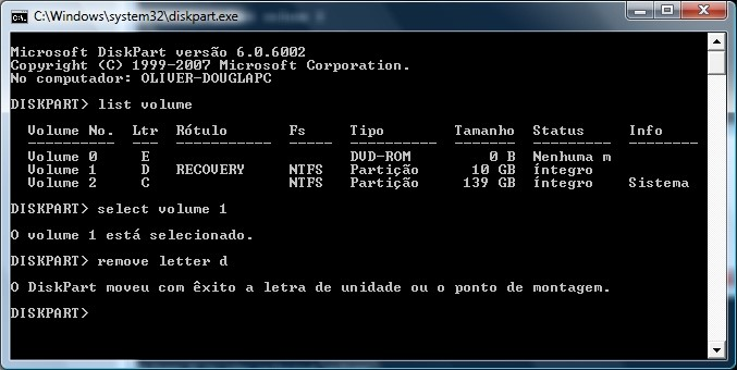 5 - Para finalizar, digite “remove letter D”, pois está relacionado ao Volume 1 que acabamos de selecionar. Apesar do nome “Remove” (Remover), ele não apagará os dados, apenas ocultará a partição. Para aplicar a modificação, reinicie o computador.