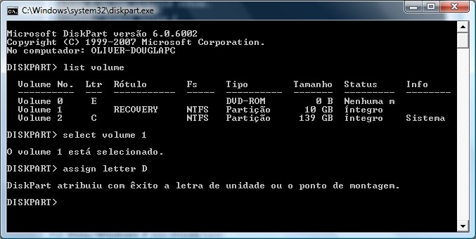 A próxima etapa depende do sistema operacional utilizado. Para o Windows XP, digite “assign letter D”. Para os Windows 7 e Vista, digite “assign letter=D”. Assim, todos os arquivos desse volume estarão disponíveis novamente para uso.